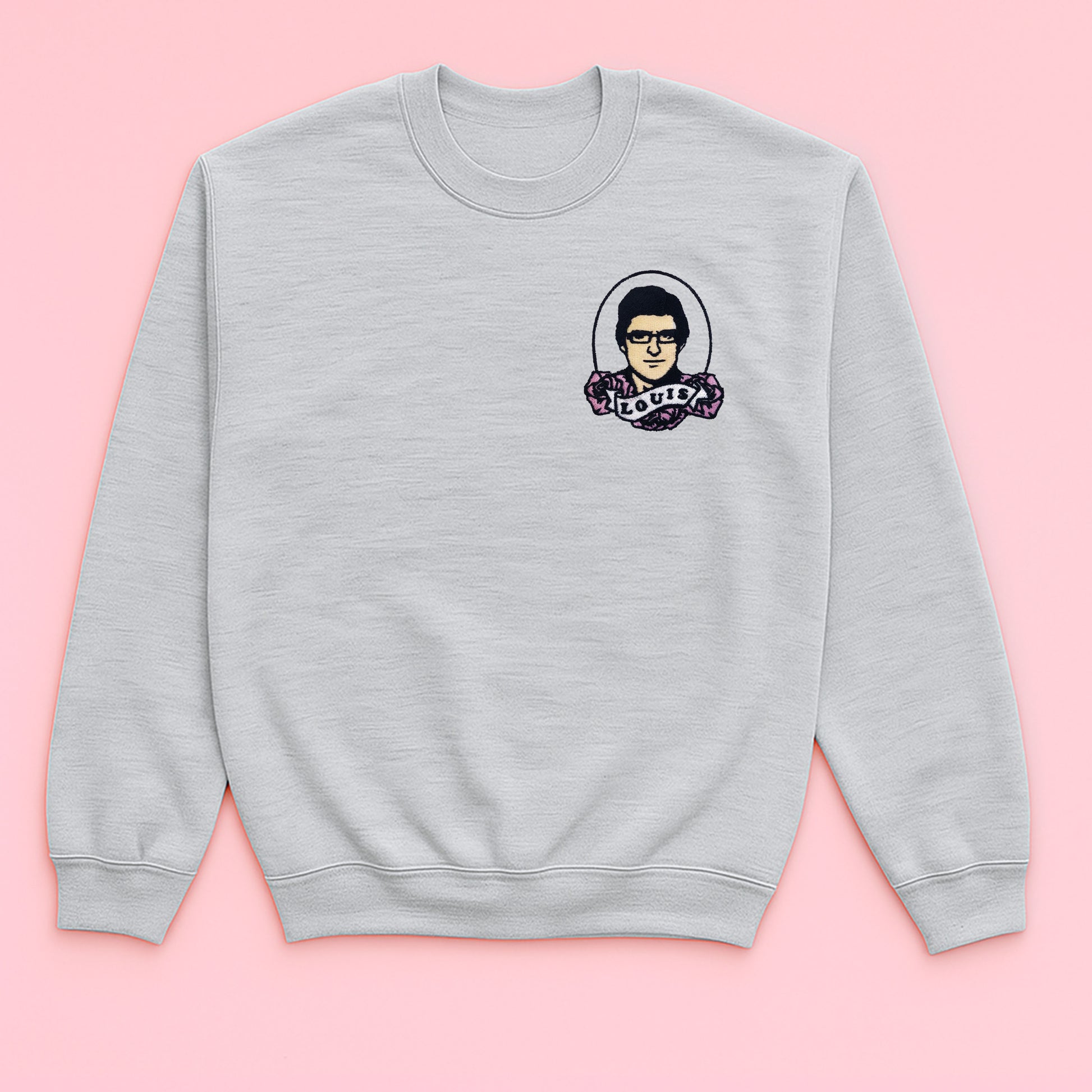 Elegant embroidery featuring a subtle homage to the legendary British documentarian Louis Theroux — iconic style meets comfy knit