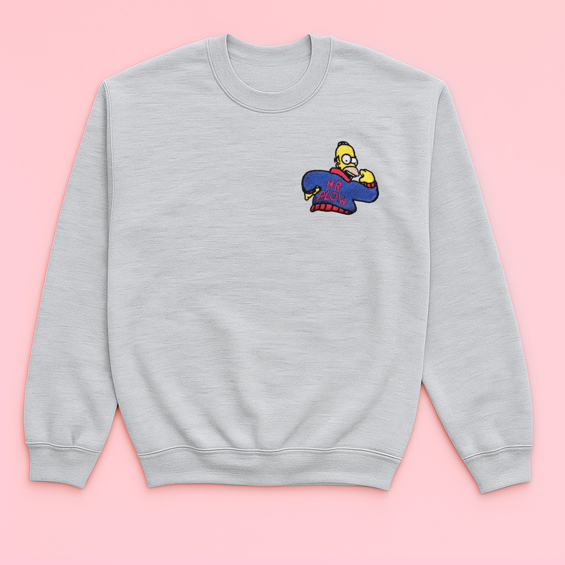 Features a detailed embroidery design of Homer as Mr Plow — snow, plow, jacket, the whole vibe.